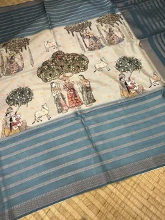 Semi Tussar Saree, beautifully inspired by traditional Kalamkari art. The saree features a captivating tableau of mythological and pastoral scenes rendered in classic Kalamkari-style prints, telling stories through intricate detailing and vibrant colors.