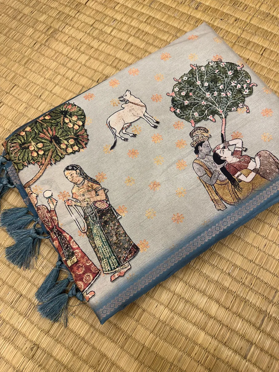 Semi Tussar saree in Kalamkari-Inspired Printed Design with Ash &Teal